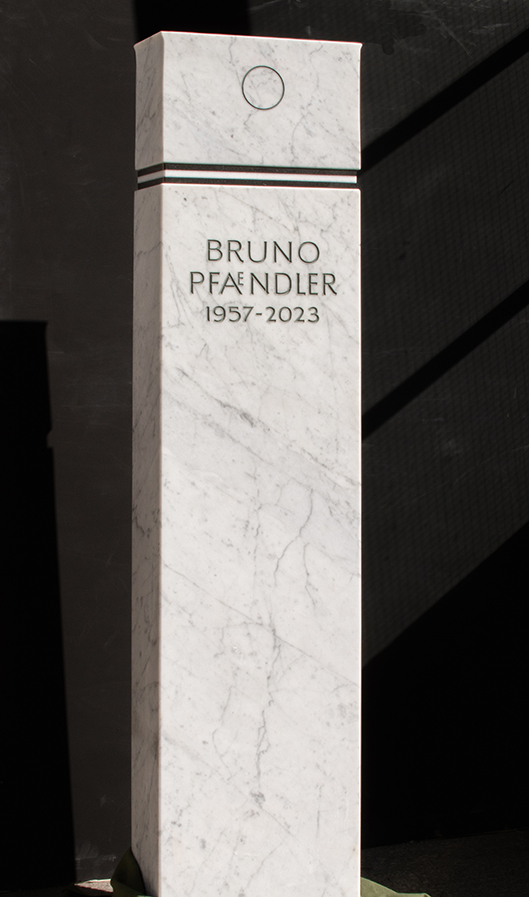 Der Verstorbene mochte Kontrast, auch in seinem Kleidungsstyl herrschte die Farbenkombi schwarz/weiss vor, dazu ein Hut à la al Capone, et voilâ. Der Stein wirkt elegant, ist sehr hoch und schmal gehalten. Senkrechte Linien prägen die Form, geteilt durch das Steinband, welche dann die Horizontale ins Spiel bringt. Die gravierte Inschrift ist graphisch gehalten. Der Kopfteil mit den nach aussen verlaufenden Spitzen vermittelt den Eindruck eines Kapitells. Ein gravierter Kreis im Kopfteil symbolisiert die Vollendung eines Lebens.